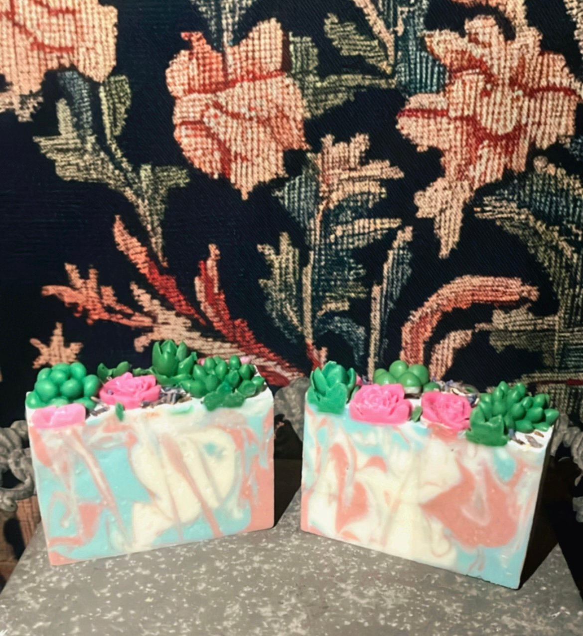 Homemade succulent design soap. Scent is peach Bellini. Great for all body parts. Made from palm, olive, coconut and safflower oil.